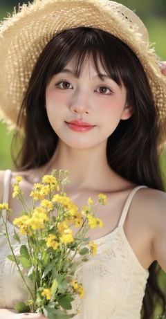 (person with straw hat,beige top,lace detail,long dark hair,beautiful detailed eyes,beautiful detailed lips,extremely detailed eyes and face,long eyelashes,smiling,standing in a sunlit meadow,holding a bouquet of wildflowers,soft sunlight,gentle breeze,blurred background,realistic,photorealistic:1.37,best quality,4k,8k,highres,masterpiece:1.2,ultra-detailed,HDR,UHD,studio lighting,ultra-fine painting,sharp focus,physically-based rendering,extreme detail description,professional,vivid colors,bokeh,summer vibe,warm tones,soft shadows,peaceful atmosphere)