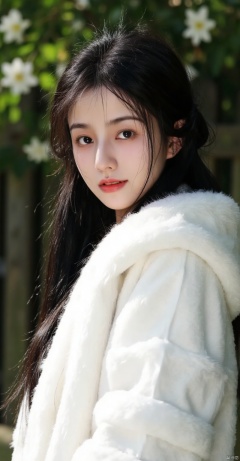 (best quality,4k,8k,highres,masterpiece:1.2),ultra-detailed,(realistic,photorealistic,photo-realistic:1.37),white fluffy coat,long dark hair,wooden background,sunny day outdoors,beautiful detailed eyes,beautiful detailed lips,extremely detailed eyes and face,long eyelashes,smiling gently,standing gracefully,soft sunlight,gentle breeze,green leaves,flowers in the background,calm and serene expression,flowing hair,relaxed posture,soft shadows,cozy atmosphere,warm colors,natural lighting,bokeh,sharp focus,physically-based rendering,extreme detail description,professional,vivid colors,summer vibe
