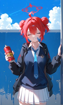 masterpiece,best quality,high quality,(colorful),[Artist miwano rag],[Artist toosaka asagi],[Artist wlop],[Artist chen bin],Artist omone hokoma agm, 1girl, solo, smile, short hair, bangs, skirt, shirt, holding, hair between eyes, school uniform, jacket, closed eyes, ahoge, red hair, pleated skirt, outdoors, necktie, sky, day, cloud, hair bun, grin, blue sky, double bun, halo, white skirt, blue sweater vest, blue necktie, paint splatter, paint, graffiti, spray can, paint splatter on face,makiBA