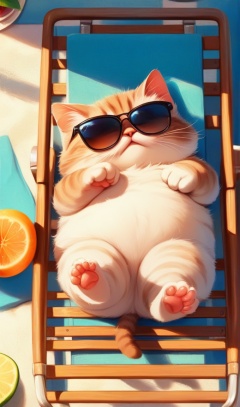 no humans,sunglasses,cat,fat cat,animal focus,animal,on back,chair,lying,lounge chair,fruit,dark tone,score_9,score_8_up,score_7_up,intricate details,solo,<lora:cute cat:0.7>,