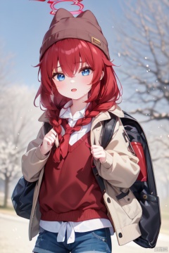 1girl, solo, long hair, looking at viewer, blush, bangs, blue eyes, shirt, long sleeves, yellow hat, red sweater,hair between eyes, jacket, braid, pantyhose, red hair, outdoors, parted lips, open clothes, necktie, shorts, puffy sleeves, collared shirt, bag, twin braids, open jacket, black pantyhose, black shirt, short shorts, white headwear, halo, backpack, red necktie, puffy long sleeves, blue shorts, yellow jacket, beanie, notice lines, legwear under shorts,makiBA, maki \(blue archive\)