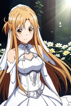 A single girl with long yellow hair, resembling Asuna from Sword Art Online, stands in a serene garden setting for a wedding photoshoot. The scene is softly lit by dappled sunlight filtering through the trees, creating a warm, inviting atmosphere. She is posed gracefully, wearing a white wedding gown with a large, ruffled skirt and intricate silver armor accents. Her expression is serene and joyful, with large, bright eyes reflecting happiness. The composition is balanced, with the girl in the center, surrounded by lush greenery, vibrant flowers, and fluttering butterflies. The art style is high-resolution anime, with smooth lines, vivid colors, and high contrast, enhancing the dreamy and fantastical atmosphere of the wedding photos.