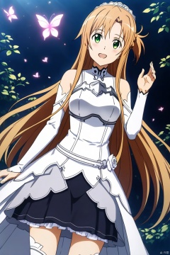 A single girl with long yellow hair, resembling Asuna from Sword Art Online, stands in a serene garden setting for a wedding photoshoot. The scene is softly lit by dappled sunlight filtering through the trees, creating a warm, inviting atmosphere with intricate light and shadow textures. She is posed gracefully, wearing a white wedding gown with a large, ruffled skirt and intricate silver armor accents. Her expression is serene and joyful, with large, bright eyes reflecting happiness. The composition is balanced, with the girl in the center, surrounded by lush greenery, vibrant flowers, and fluttering butterflies. The art style is high-resolution 2.5D CG, blending semi-realistic photos with smooth lines, vivid colors, and high contrast, enhancing the dreamy and fantastical atmosphere of the wedding photos. The image features three-dimensional, layered, and rich details, rendered in 8K resolution for exceptional clarity and depth.