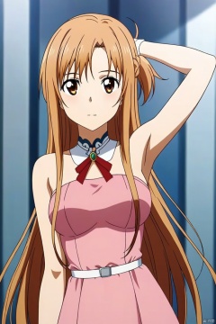 A half-body perspective of a 1girl with yellow long hair, dressed in Asuna's pink dress, captured in a dynamic pose. The scene features light and shadow texture, creating a three-dimensional and layered effect with rich details. Rendered in 8K resolution, the image blends 2.5D CG with semi-realistic photos, showcasing a high level of realism and depth.