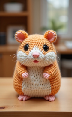 miluo_maoxian, A knitted hamster sitting on top of a wooden table.<lora:miluo丨画了个毛线v1.6:1>