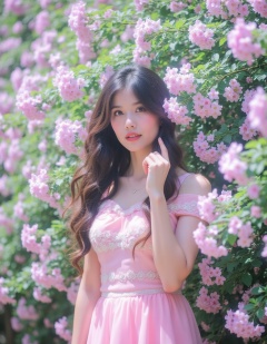<lora:huajishaonv:1>,huaji,At eye level,a woman wearing a pink dress stands in front of a tree full of pale pink flowers. Her hair is long and curly,and the background camera has a blurred effect,