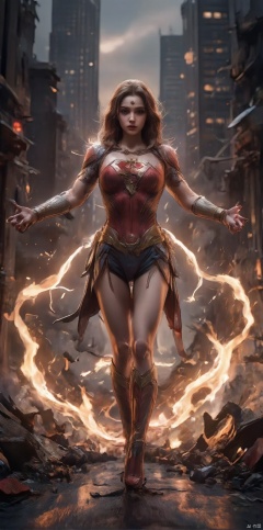 Superwoman stands heroically in a cityscape at dusk, as she summons her powers to save the day from an impending disaster. Cinematic lighting bathes her in warm, golden tones, with deep shadows accentuating her determined expression and rippling muscles. The camera captures her dynamic pose, arms outstretched and fists clenched, as she unleashes a barrage of energy blasts towards the looming threat. The city's towering skyscrapers loom in the background, their lights reflecting off the wet pavement as the sounds of chaos and destruction fill the air.