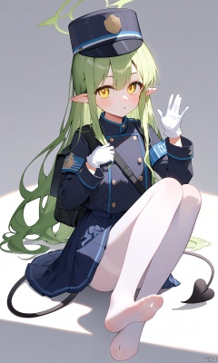(score_9,score_8_up,score_7_up), 1girl,solo,(masterpiece:1.3),( beautiful:1.2),(high quality:1.2),(finely detailed:1.2),extremely detailed CG unity 8k wallpaper,best quality,a very delicate and beautiful,perfect fingers,1girl, solo, long hair, looking at viewer, blush, bangs, skirt, white background, shirt, gloves, long sleeves, hat, hair between eyes, very long hair, jacket, tail, full body, yellow eyes, white pantyhose, pleated skirt, green hair, necktie, pointy ears, white gloves, bag,uniform, arms up, blue skirt, black headwear, halo, backpack, demon tail, armband, peaked cap, white pantyhose, hikariBA, loli, sitting , feet, no_shoes, toes, soles, striped_pantyhose