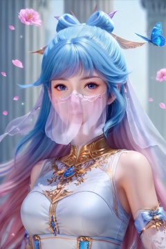 masterpiece, best quality, masterpiece,best quality,official art,extremely detailed CG unity 8k wallpaper,1girl,solo,hair ornament,long hair,looking at viewer,jewelry,multicolored hair,blue eyes,dress,blue hair,pink hair,flower,ribbon,petals,detached collar,bug,blue butterfly,sparkle,pillar,tattoo,(veil:1.3),(mouth veil:1.3),portrait,smile