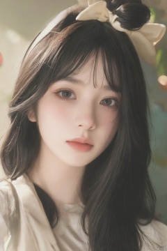 1girl, solo, long hair, looking at viewer, bangs, black hair, ribbon, brown eyes, closed mouth, hair ribbon, upper body, sleeveless, indoors, lips, white ribbon, head rest, realistic