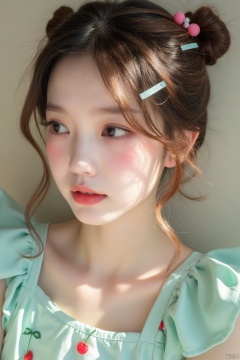 Close-up portrait of a young woman with light brown, wavy hair styled in loose buns. Delicate, light-blue hair clips adorn her forehead. Soft, rosy blush and light peach eyeshadow accentuate her features. Large, light-blue contacts enhance her eyes. Her expression is contemplative, slightly pensive. She's wearing a light teal, sleeveless top with light-blue ribbons and small, red cherry decorations. The light is soft and diffused, casting no harsh shadows. The background is a neutral, light beige wall, subtly visible behind her. The overall style is delicate, cute, and slightly stylized, bordering on kawaii. The image's mood is sweet and serene. Color palette is pastel-toned with subtle, muted highlights.