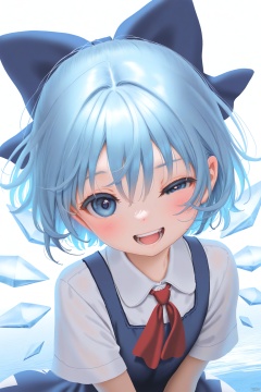 newest, absurdres, highres, sensitive, 1girl, solo, cirno, blue hair, ice, blue eyes, bow, hair bow, ice wings, open mouth, blue bow, upper body, teeth, smile, looking at viewer, white background, white shirt, blush, shirt, short sleeves, dress, blue dress, wings, short hair, simple background, hair between eyes, water, collared shirt, uneven eyes, ascot, red ascot, one eye closed,