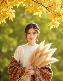 <lora:lora-qiutian2:1>,qiutian,Portrait of a young woman with an ethereal expression,standing in a sunlit autumn setting. She is positioned slightly off-center to the right,wearing a white top and a patterned brown and orange shawl. Her hair is styled in an elegant updo,and she holds a large,fluffy,beige pampas grass bouquet. The background features soft-focus green foliage,creating a dreamy atmosphere. Overhead,vibrant yellow autumn leaves hang from a tree,framing the scene. The lighting is soft and diffused,casting a warm,golden glow across the image. High-key photography,shallow depth of field,warm color palette,natural lighting,serene,ethereal,autumnal mood,visually balanced composition.,