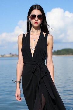 1girl,dress,black hair,solo,breasts,long hair,black dress,jewelry,cleavage,looking at viewer,water,necklace,sky,outdoors,sunglasses,watercraft,day,blue sky,red lips,sleeveless,sleeveless dress,cloud,eyewear hang,standing,eyewear removed,bracelet,