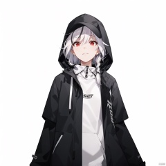 (white background:1.2),looking at viewer,(SOLO:1.4),outline,simple background,full body,looking at viewer,(((arms at side))), red eyes,white hair,multicolored hair,black feathers,jacket,white shirt,hood up,black headwear,sleeves past wrists,baseball cap,clothes writing,white footwear,sneakers,long hair,shoes,long sleeves,streaked hair,open jacket,open clothes,black pants,hoodie,hooded jacket,hood,hair between eyes