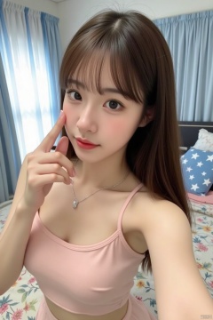 A young Asian woman is taking a selfie in a cozy bedroom. She is wearing a light pink crop top that reveals her midriff and a delicate necklace with a small pendant. Her long, dark brown hair with bangs frames her face, and she is holding her right hand up to her cheek, with her index finger and thumb touching her face, and her other fingers curled inwards. Her left arm is extended, holding the camera or phone to capture the shot. The background features a bed with a floral-patterned comforter and a blue pillow adorned with white stars. Behind her, a window with blue and white curtains allows light to filter in, adding a soft, inviting ambiance to the scene.