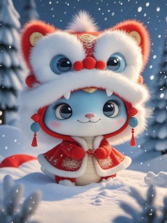 shenian,wearing a Nian beast hat,A cute blue and white baby snake with big, expressive eyes and a tiny nose is dressed in a red furry lion costume with a white mane.  It's cold in the snow and surrounded by snow-covered pine trees.  The whole scene is very strange and festive, with soft and bright lighting, full of magical winter atmosphere.,<lora:shebaobaov1-000014:0.8>