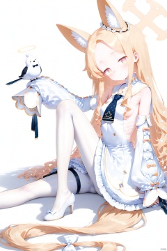 masterpiece, best quality,Artist Style,1girl, seia \(blue archive\), blue archive, absurdly long hair, animal ear fluff, animal ears, armpit crease, backless dress, backless outfit, bird, bird on leg, blonde hair, blue neckerchief, blush, bow, breasts, bright pupils, closed mouth, detached sleeves, dress, flower, flower wreath, footwear bow, forehead, fox ears, from side, full body, gradient eyes, hair bow, hair flower, hair ornament, halo, head tilt, high heels, knee up, long hair, long sleeves, looking at viewer, multicolored eyes, neckerchief, orange eyes, pantyhose, parted bangs, puffy long sleeves, puffy sleeves, ribs, sailor collar, sideboob, simple background, sitting, sleeves past wrists, slit pupils, small breasts, smile, solo, striped clothes, striped pantyhose, vertical-striped clothes, vertical-striped pantyhose, very long hair, white background, white bow, white dress, white footwear, white pantyhose, white pupils, white sailor collar, yellow eye