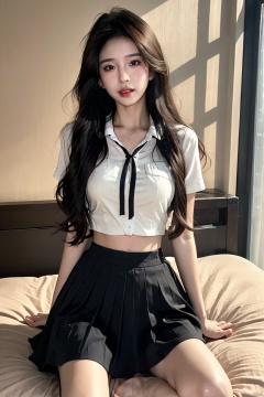 Enhanced, masterpiece, 16K, JK, 1 girl, long hair, school uniform, skirt, sitting on bed,:), Light master