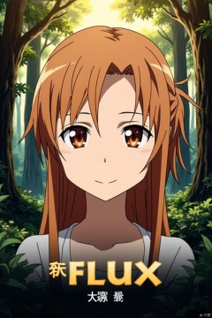 A serene close-up of Asuna, a 1girl with long, smooth brown hair partially tied up, her bright brown eyes firm yet shyly smiling. The background features a mysterious forest with tall trees, lush foliage, and floating leaves, illuminated by dappled yellowish-white light. Surrounding plants add a natural touch. Below, Asuna FLUX in artistic, 3D poster text with AGlong beneath, both designed for a movie poster.