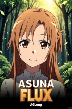 A close-up shot of Asuna, a 1girl with long, smooth brown hair partially tied up, her bright brown eyes firm yet shyly smiling. The background is a mysterious forest with tall trees, lush foliage, and floating leaves, illuminated by dappled yellowish-white light. Green leaves and plants add a natural touch. Below, Asuna FLUX in artistic, 3D poster text with AGlong beneath, both designed for a movie poster.