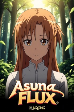 A close-up shot of Asuna, a 1girl with long, smooth brown hair partially tied up, her bright brown eyes firm yet shyly smiling. The background is a mysterious forest with tall trees, lush foliage, and floating leaves, illuminated by dappled yellowish-white light. Green leaves and plants add a natural touch. Below, Asuna FLUX in artistic, 3D poster text with AGlong beneath, both designed for a movie poster.