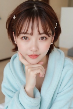 Close-up portrait of a young woman with short, brown hair styled with bangs. She wears a light, powder-blue bathrobe, showcasing a soft, textured material. Delicate pearl hair clips adorn her hair. Her expression is friendly and slightly playful, her gaze directed towards the viewer. The lighting is soft and natural, highlighting her features. The background is a neutral beige wall, with white elements suggestive of a room. Composition focused on the subject. Gentle, comfortable, and intimate atmosphere. Natural makeup, highlighting her facial features. Soft focus on her face. A simple, everyday aesthetic. Candid portrait style.