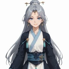 (white background:1.2),looking at viewer,(SOLO:1.4),outline,simple background,upper body, cowboy shot,looking at viewer,(((arms at side))),  fu_hua_fusheng,long hair,bangs,blue eyes,parted bangs,hair bun,hair ornament,grey hair,blue hair,smile,earrings,single bun,<lora:浮生仙人-pony:0.8>