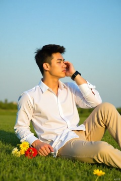 Haonan,A serene landscape: A youthful figure reclines upon a vibrantly green grassy terrain, clad in a pristine white shirt and leadership-inspired ensemble, complemented by rugged cowboy pants. Warm sunlight casts a gentle glow, illuminating a colorful bouquet of fresh flowers nearby. The subject's hand rests nonchalantly on his wristwatch as he contemplates the clear blue sky above.