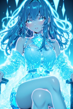green tone,girl with green hair and green eyes sitting on a chair in front of a blue background. She is wearing a white dress and has a determined expression on her face,as if she is ready to take on any challenge that comes her way. Her long,dark hair is blowing in the wind and her eyes are focused on something in the distance.,