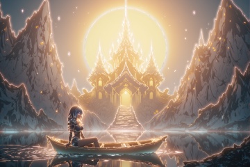 This is a digital painting in a vivid, semi-realistic style, depicting an ethereal and mystical scene. The central focus is a solitary figure in a traditional, narrow wooden boat, gliding across a calm, reflective lake. The figure, dressed in a dark, form-fitting outfit with a hood, is positioned slightly off-center to the left, facing the scene. The boat's oars are not in use, suggesting a serene moment of contemplation.In the background, towering, jagged stone structures frame a grand, golden temple with ornate, curved roofs. These structures are illuminated by the large, luminous yellow moon that dominates the upper half of the image, casting a soft, warm glow across the scene. The moonlight creates a surreal, dreamlike atmosphere, enhancing the ethereal quality of the paintin