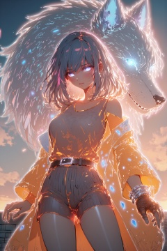 a young woman with a confident,determined expression. She has medium-length,dark brown hair and dark skin,wearing a bright orange,long coat that flows behind her as she stands on a ledge. Her outfit includes a dark brown,high-waisted skirt and a belt with a large buckle. She also wears a brown glove on her right hand,which is adorned with intricate,metallic detailing.,Behind her,looming large,is a massive,mechanical wolf head with glowing blue eyes and intricate,mechanical features. The wolf's head is positioned slightly above and behind the woman,adding a sense of protection or companionship. The background is a dramatic sky with fluffy,white clouds against a gradient of deep blue and orange,suggesting a sunset or dawn.,