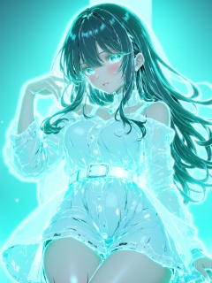 illustration,green tone,girl with green hair and green eyes sitting on a chair in front of a blue background. She is wearing a white dress and has a determined expression on her face,as if she is ready to take on any challenge that comes her way. Her long,dark hair is blowing in the wind and her eyes are focused on something in the distance.,