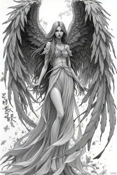 A graceful, ethereal winged woman in mid-flight, depicted in a grayscale style with dramatic black ink-like splashes and streaks. Large, detailed wings, filled with intricate feather details, extend outward, and the woman is poised in a dynamic, upward-angled posture, with flowing hair and a flowing, white gown. The subject's expression is serene, almost meditative, with a hint of intensity. The composition is centered on the figure, with a white background emphasizing the dramatic contrasts in textures and black splashes. Soft, diffused lighting creates subtle highlights on the figure, contrasting with the deep blacks. The wings and hair have a textured, almost painterly, quality, with subtle variations in shading. The overall mood is mysterious and powerful, evoking a sense of wonder and an otherworldly grandeur. Ink-splatter artistic style, with careful detail to the wings, form and pose of the character. The perspective is a full view, framing the subject from head to toe with the wings fully displayed. The use of grayscale emphasizes the artistic elements and mood. The figure is rendered with a stylized digital illustration quality.