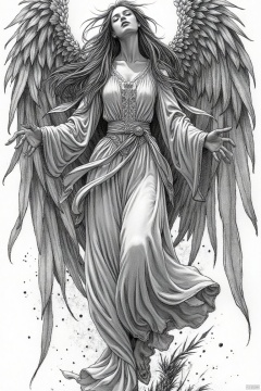A grayscale portrayal of a majestic angel. The angel, with flowing dark-grey hair and serene expression, is depicted in mid-flight with large, detailed wings. Her pose is dynamic, arms outstretched, as if in the midst of a grand ascent or descent. The angel's dress, a light grey flowing robe with intricate, delicate patterns, billows around her form, emphasizing a sense of movement and ethereal grace. The lighting is soft, casting subtle shadows that accentuate the curves of the figure and the drapery of the garment. Fine details are evident, showcasing the texture and volume of the angel's wings, dress and the flowing fabric. The background is a stark white, punctuated by scattered, stylized black splatters evoking a sense of dynamic energy. The style is akin to meticulous pen-and-ink drawings, crafted for a powerful and artistic rendering. The intricate shading, emphasizing volume and form, suggests a highly detailed pencil sketch. The angel's gaze is directed slightly off to the side, conveying a sense of introspection and serenity. The composition is centered, showcasing the angel in its entirety. This grayscale angel is a dramatic illustration, a testament to meticulous detail work, evoking a classical-gothic style.
