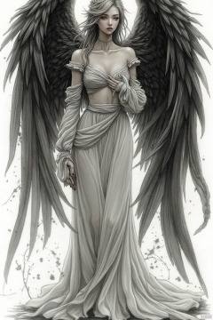 A majestic female figure, a dark-winged angel, stands poised in a flowing, ethereal white gown. Her expression is serene and regal, with a hint of mystery. Large, detailed black angel wings, depicted with a textured, almost painterly quality, extend outwards, framing her figure. The dress, composed of soft, flowing fabric, drapes elegantly, with subtle details of a light grey/silver stitching or embroidery. The colors are muted, with a focus on soft whites, grays, and blacks. The lighting is diffused, casting soft shadows, creating a sense of depth and dimension. A light, almost watercolor-like effect is used throughout, including speckles and splatters of black/grey inks or paint around her figure, suggesting a dramatic, almost ethereal atmosphere. The background is a stark, white, emphasized by the use of light. The overall style suggests a blend of digital painting with traditional art techniques. The perspective is centered on the figure, giving an air of serenity and power. The portrayal exudes a sense of spiritual presence and grace. A sense of solemnity, yet quiet power, is evident. The artist's technique is evident in the meticulous detailing of the wings, flowing robes, and delicate expression of the angel.