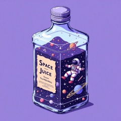 Inside the Bottle, This is a digital drawing in a vector illustration style featuring a clear glass bottle filled with a cosmic scene. The bottle is square-shaped and has a metallic cap with a small, circular opening. Inside the bottle, a small astronaut is floating in a vast, space-like environment. The astronaut, wearing a white spacesuit with red details, including a helmet with a visor, is positioned in the center of the bottle, appearing to be in mid-flight. Surrounding the astronaut are various celestial bodies and objects: a large, colorful planet with rings, a comet with a long, flowing tail, and several small, sparkling stars. The background of the bottle is filled with a deep purple color, creating a contrast with the clear glass and the vibrant cosmic scene inside. The text on the label reads "Space Juice From The Milk Way" in black, with additional smaller text in the bottom left corner. The overall image is whimsical and imaginative, combining elements of science fiction with a playful, artistic flair.