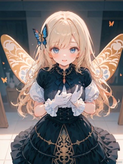perspective composition,dynamic angle,((rough Alphonse Mucha oil painting style:1.1))Anime of 1 girl is fly in the air and smile and surrounded by a lot of surreal painting gold butterfly filigree,broken glass,brown long hair:1,wear gold butterfly filigree outfit coat fashion costume with ruffled layers),from above,dynamic pose,dynamic angle,golden splendid background),white gloves,