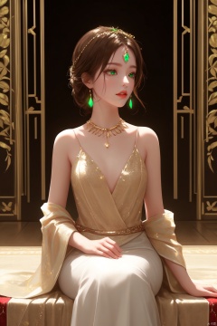 1 girl, A Central Asian princess, she has emerald eyes, brown hair,  white dress,and some gold jewelry inlaid with green gems on her head. She looks sideways into the distance, In the background is a palace, hime cut,sitting sideways, an extremely delicate and beautiful, an extremely delicate and beautiful girl, extremely detailed, beautiful detailed eyes, glowing eyes, bare shoulder, detailed light, shine, hairs between eyes