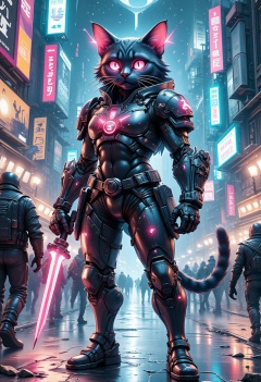 A cyberpunk-themed anthropomorphic cat gladiator standing confidently in a futuristic neon-lit arena. The cat has a sleek, muscular humanoid body with short, glossy fur and distinct feline features like sharp ears, glowing cybernetic eyes, and a swishing tail with mechanical enhancements. It wears high-tech, futuristic armor with neon accents, including a chest plate with holographic displays, armored gauntlets, and shoulder pads adorned with glowing circuit patterns. The cat wields a futuristic energy sword that crackles with electricity in one hand and a glowing, translucent energy shield in the other. The arena is surrounded by towering holographic billboards, flashing lights, and a cheering crowd of various cyberpunk characters. The atmosphere is intense, with a mix of rain, neon reflections on wet surfaces, and a gritty, high-tech urban vibe, creating a scene full of dynamic energy and futuristic combat,Catropomorphism,Wtrz Bckgrnd,Anime,Illustration,white background,pastelz