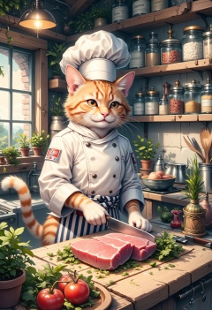 An anthropomorphic cat chef in a cozy, rustic kitchen, preparing a fresh tuna dish. The cat stands upright with a humanoid form, covered in sleek fur with feline features like pointed ears, whiskers, and a long, swishing tail. It wears a traditional white chef's jacket, a tall chef's hat, and a striped apron. The cat is skillfully slicing a large, fresh tuna on a wooden cutting board with a sharp chef's knife, focusing intently on its work. The kitchen is filled with vibrant ingredients, including herbs, spices, and vegetables neatly arranged around the countertop. The atmosphere is warm and inviting, with soft sunlight streaming in through a nearby window, casting a golden glow on the scene. The shelves are lined with jars and bottles, adding to the cozy, culinary ambiance, while the cat chef prepares the tuna with expertise and precision,Catropomorphism,Wtrz Bckgrnd,Anime,Illustration,white background,pastelz