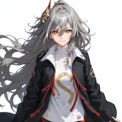 (white background:1.2),looking at viewer,(SOLO:1.4),outline,simple background,upper body, cowboy shot,looking at viewer,(((arms at side))),   fu hua,senti,long hair,bangs,hair ornament,red eyes,hair between eyes,smile, multicolored hair,streaked hair,white hair,gray hair,yellow pupils,diamond shaped pupils,autumn leaves,black jacket,black footwear,thighs,messy hair,jacket<lora:naicha-pony:0.8>