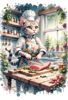 A whimsical watercolor painting of an anthropomorphic cat chef in a cozy kitchen, preparing a fresh tuna dish. The cat stands upright with a slender, humanoid form, covered in soft, textured fur in shades of gray and white, with expressive feline features like large, bright eyes, pointed ears, and a swishing tail. It wears a charming, loose-fitting white chef's jacket, a tall chef's hat, and a colorful apron splattered with artistic paint-like details. The cat chef is carefully slicing a fresh tuna on a rustic wooden cutting board, with delicate strokes capturing the motion and precision of its work. The kitchen is filled with vibrant, softly blended watercolor hues, featuring shelves lined with jars, herbs hanging from the ceiling, and fresh vegetables scattered around. Sunlight filters through a nearby window, casting a dreamy, golden wash over the scene, creating a warm and inviting atmosphere. The overall style is loose and painterly, with soft edges, subtle color gradients, and a cozy, storybook charm,Catropomorphism,Wtrz Bckgrnd,Anime,Illustration,white background,pastelz