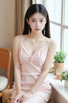 1girl, solo, long hair, breasts, looking at viewer, black hair, dress, cleavage, bare shoulders, brown eyes, jewelry, medium breasts, sitting, earrings, necklace, lips, head tilt, window, chair, realistic