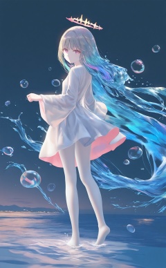 masterpiece,best quality,high quality,(colorful),artist Alens,Artist torino aqua,Artist\:ciloranko,Artist hiten \(hitenkei\),artist wlop,artist tianliangduohefangdongye,loli,1girl,solo,long hair,halo,dress,white dress,very long hair,absurdly long hair,full body,looking at viewer,multicolored hair,colored skin,liquid hair,long sleeves,looking back,wide sleeves,purple eyes,white pantyhose,barefoot,soles,blonde hair,from behind,pantyhose,blue hair,gradient hair,standing,pink eyes,aqua hair,expressionless,white skin,grey hair,water,floating hair,bubble,two-sided fabric,short dress,green skin,