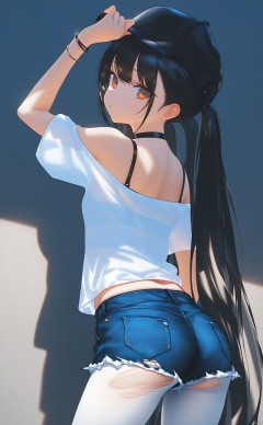 masterpiece,best quality,high quality,loli,1girl,denim_shorts,denim,shorts,white_pantyhose,pantyhose,solo,long_hair,hat,ass,black_hair,baseball_cap,jewelry,shirt,short_shorts,looking_at_viewer,bracelet,cutoffs,white_shirt,torn_clothes,off_shoulder,from_behind,looking_back,torn_shorts,blue_shorts,orange_eyes,torn_pantyhose,necklace,black_headwear,choker,arm_up,twintails,very_long_hair,off-shoulder_shirt,bare_shoulders,short_sleeves,standing,against_wall,pantyhose_under_shorts,bra_strap,hand_on_headwear,breasts,brown_eyes,underbutt,thighs,black_choker,midriff_peek,back,