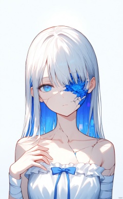 masterpiece,best quality,high quality,(colorful),1girl,solo,bandages,bandaged arm,long hair,glitch,blue eyes,looking at viewer,dress,colored inner hair,collarbone,closed mouth,white hair,blue theme,frilled dress,cracked skin,white background,bow,frills,upper body,white dress,head tilt,hand up,multicolored hair,blue hair,expressionless,crack,simple background,one eye covered,bare shoulders,blue bow,straight hair,hair behind ear,straight-on,strapless dress,