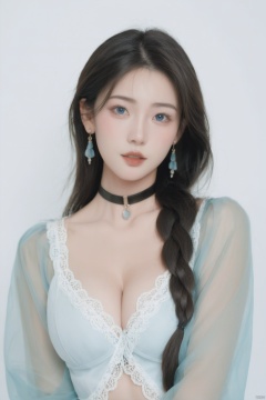 score_9,score_8_up,score_7_up,1girl, solo, long hair, breasts, looking at viewer, blue eyes, large breasts, black hair, long sleeves, cleavage, jewelry, medium breasts, upper body, braid, earrings, parted lips, choker, lips, see-through, gradient, gradient background, blue background, black choker, lace trim, lace, realistic