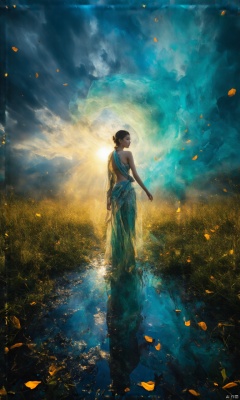 by Andy Kehoe, a gradient masterpiece, blue cyan yellow, Rococopunk, luminism, seamless, China ink, Ink Bubbles, Gold leaf lines, alcohol ink elements, curved lines, cinematic, realism, chiaroscuro, Shadow play, Gold leaf small lines, bright splashes of alcohol ink puddles, volumetric light, auras, rays of sunlight, bright colors reflect, digital art, smog, pollution, toxic waste,
