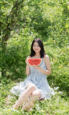 18yo Japanese girl, long straight black hair, wearing a light summer dress, sitting in a sunny garden, holding a slice of watermelon with a joyful smile, surrounded by lush green plants and vibrant flowers, the atmosphere is fresh and lively, capturing the essence of a bright summer day, the sunlight casting a warm and natural glow on her skin,